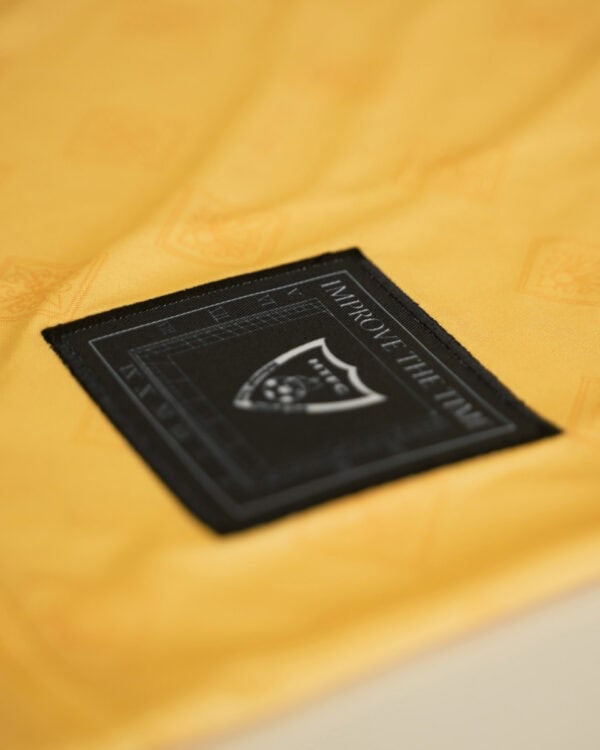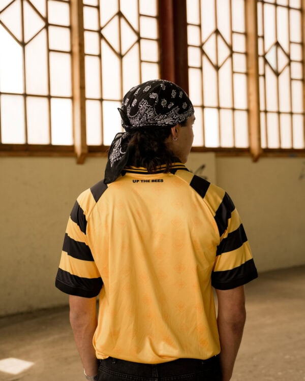 Una camiseta con corte retro (NUEVO TALLAJE MÁS ANCHO), cuello polo negro con ribetes amarillos, mangas raglán con una trama bee, escudo completamente bordado y un insert en el cuello con una pequeña abeja bordada.